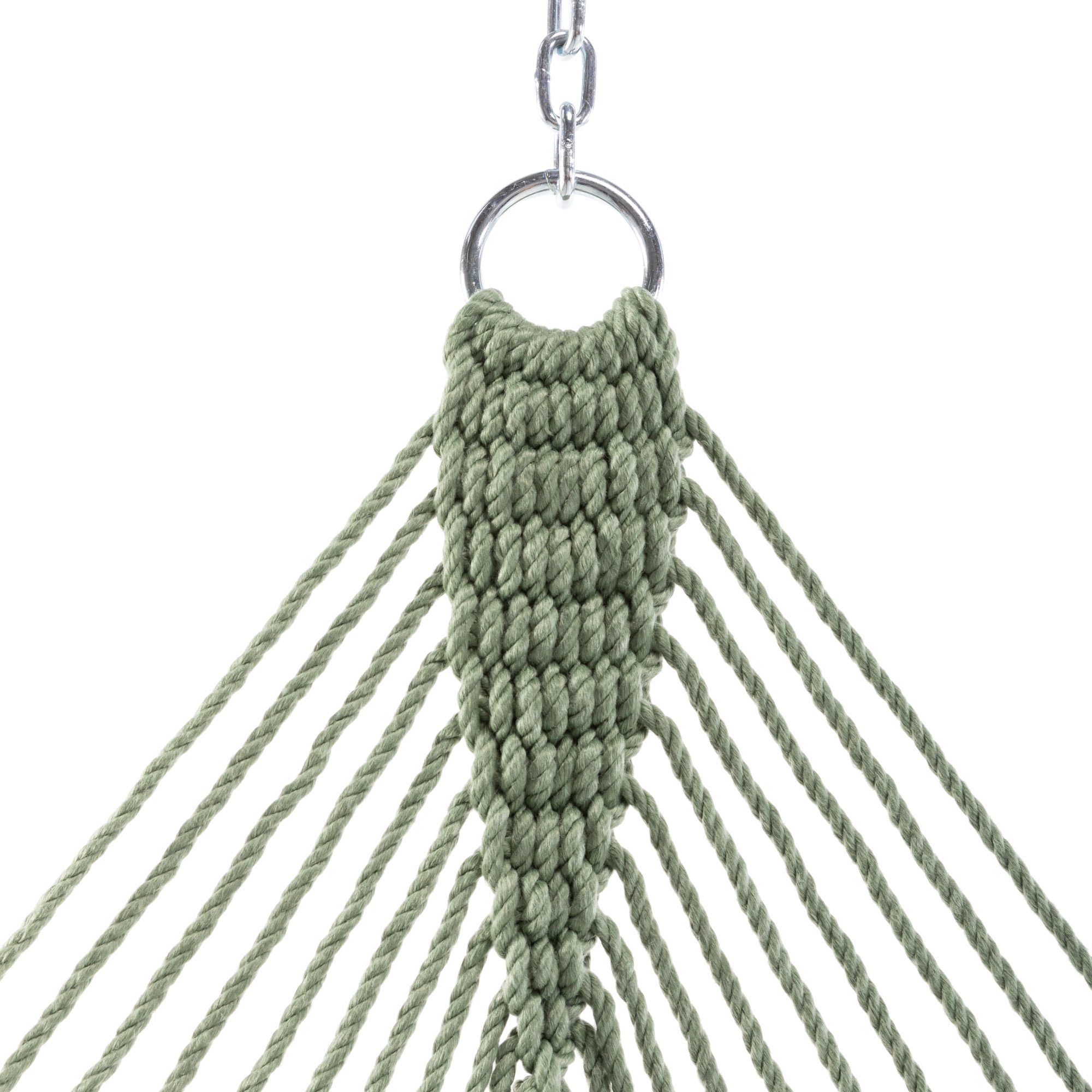Our own proprietary solution-dyed synthetic blend of rope, DURACORD®, blends the softness of cotton with the durability of polyester. Made in the Carolinas, this combination yields a rope that has excellent color steadfastness and superior feel. DURACORD® is dyed when spun, producing a rope that is colored all the way through. Like a carrot when sliced open, DURACORD® has the same color on both the inside and the outside. Our DURACORD® rope is the densest rope on the hammock market at 85 ft./lb., this results in less stretching and increased support when relaxing in your hammock.
