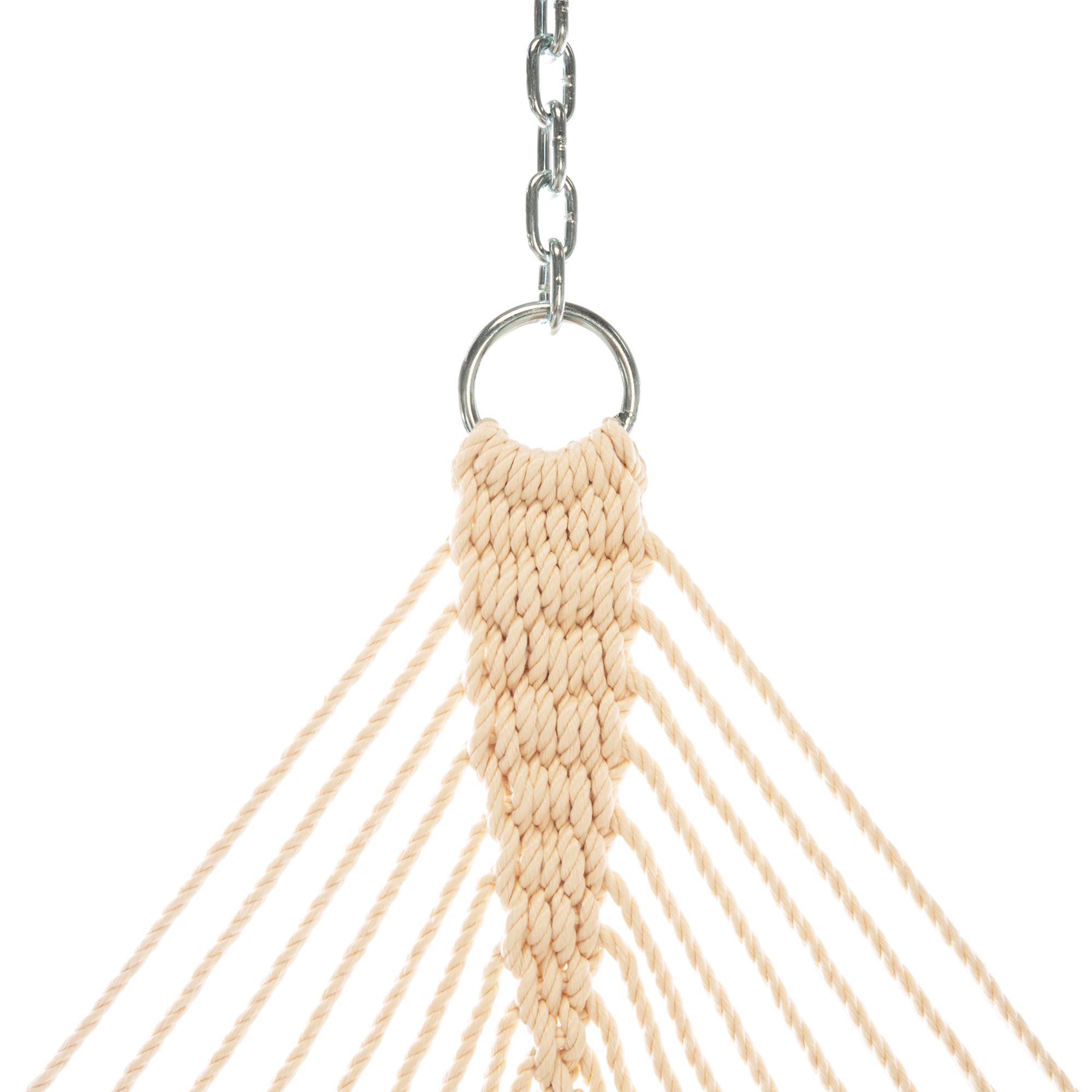 Our own proprietary solution-dyed synthetic blend of rope, DURACORD®, blends the softness of cotton with the durability of polyester. Made in the Carolinas, this combination yields a rope that has excellent color steadfastness and superior feel. DURACORD® is dyed when spun, producing a rope that is colored all the way through. Our DURACORD® rope is the densest rope on the hammock market at 85 ft./lb., this results in less stretching and increased support when relaxing in your hammock.
