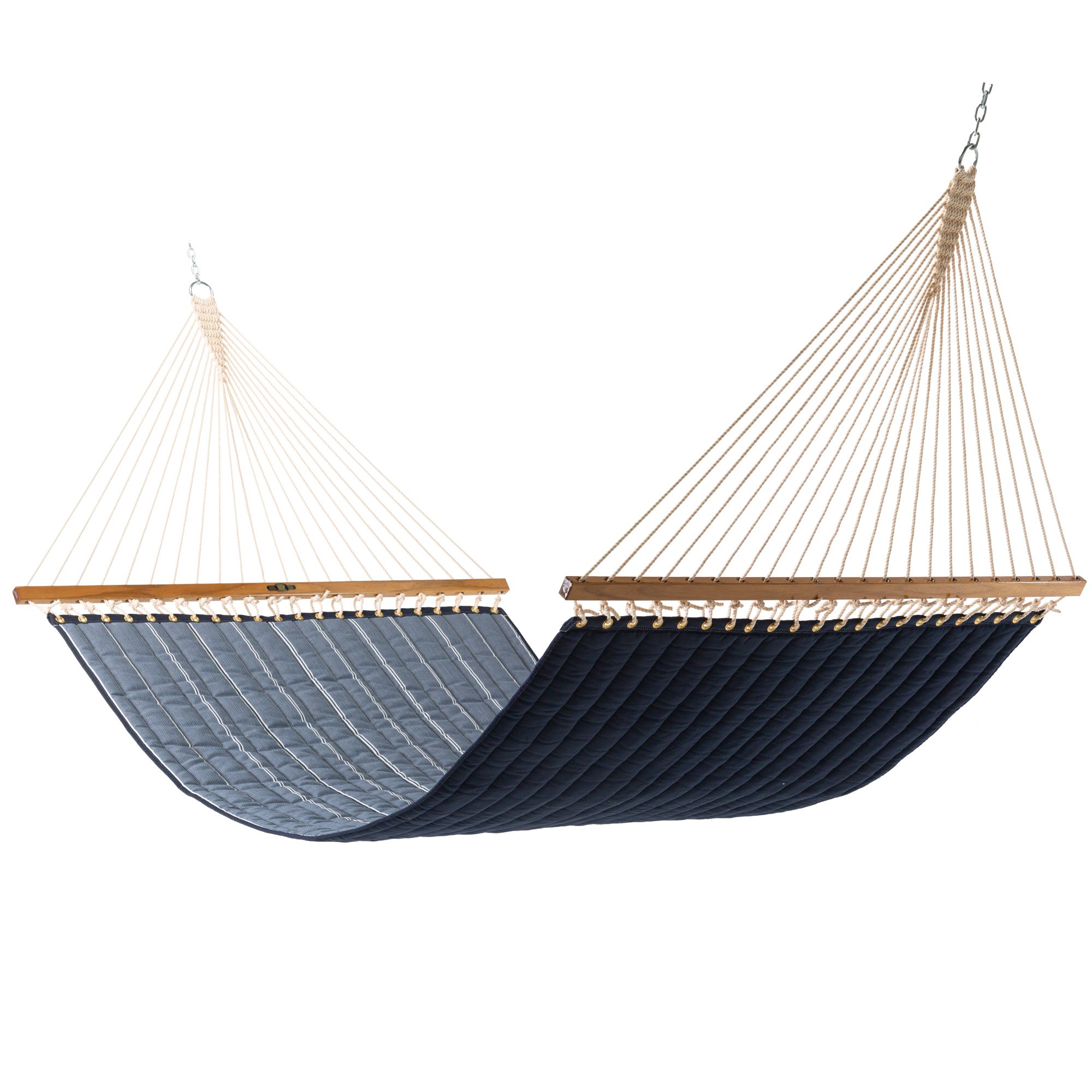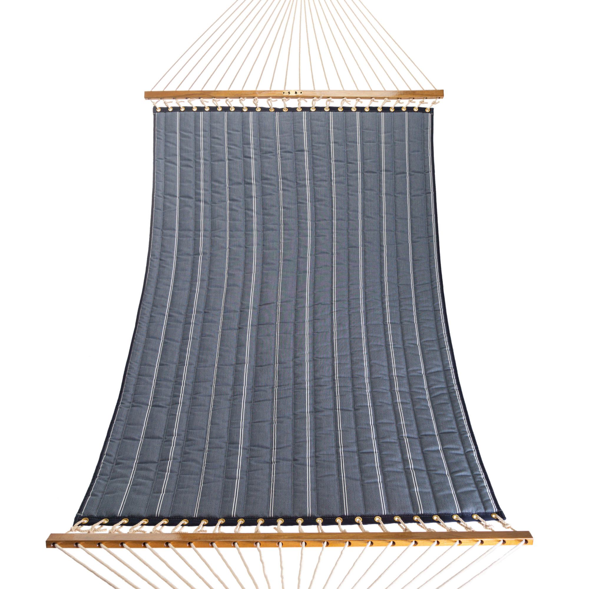 Ideal for everything from easygoing afternoons to starlit evenings, the Sunbrella Equal Ink Quilted Hammock offers a peaceful escape in the comfort of your outdoor sanctuary. Its blend of bold design, durable materials, and superior comfort makes it a standout choice for those who appreciate both form and function in their outdoor furniture. Featuring a striking pattern in shades of deep ink blue, this hammock adds a bold yet refined touch to your outdoor space. Its quilted design not only enhances comfort but also brings a elegance aesthetic that complements any patio, garden, or backyard.