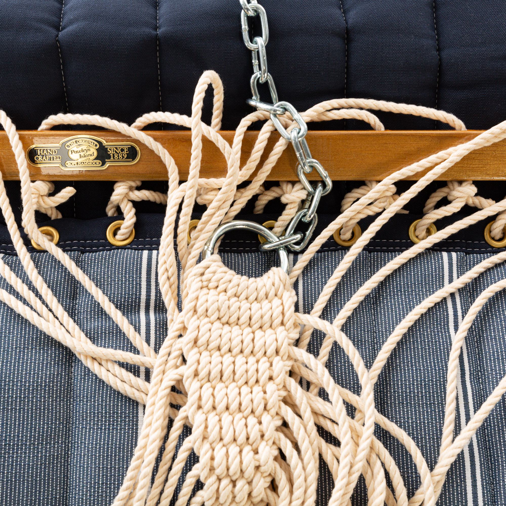 Our own proprietary solution-dyed synthetic blend of rope, DURACORD®, blends the softness of cotton with the durability of polyester. Made in the Carolinas, this combination yields a rope that has excellent color steadfastness and superior feel. DURACORD® is dyed when spun, producing a rope that is colored all the way through. Like a carrot when sliced open, DURACORD® has the same color on both the inside and the outside. Our DURACORD® rope is the densest rope on the hammock market at 85 ft./lb., this results in less stretching and increased support when relaxing in your hammock.