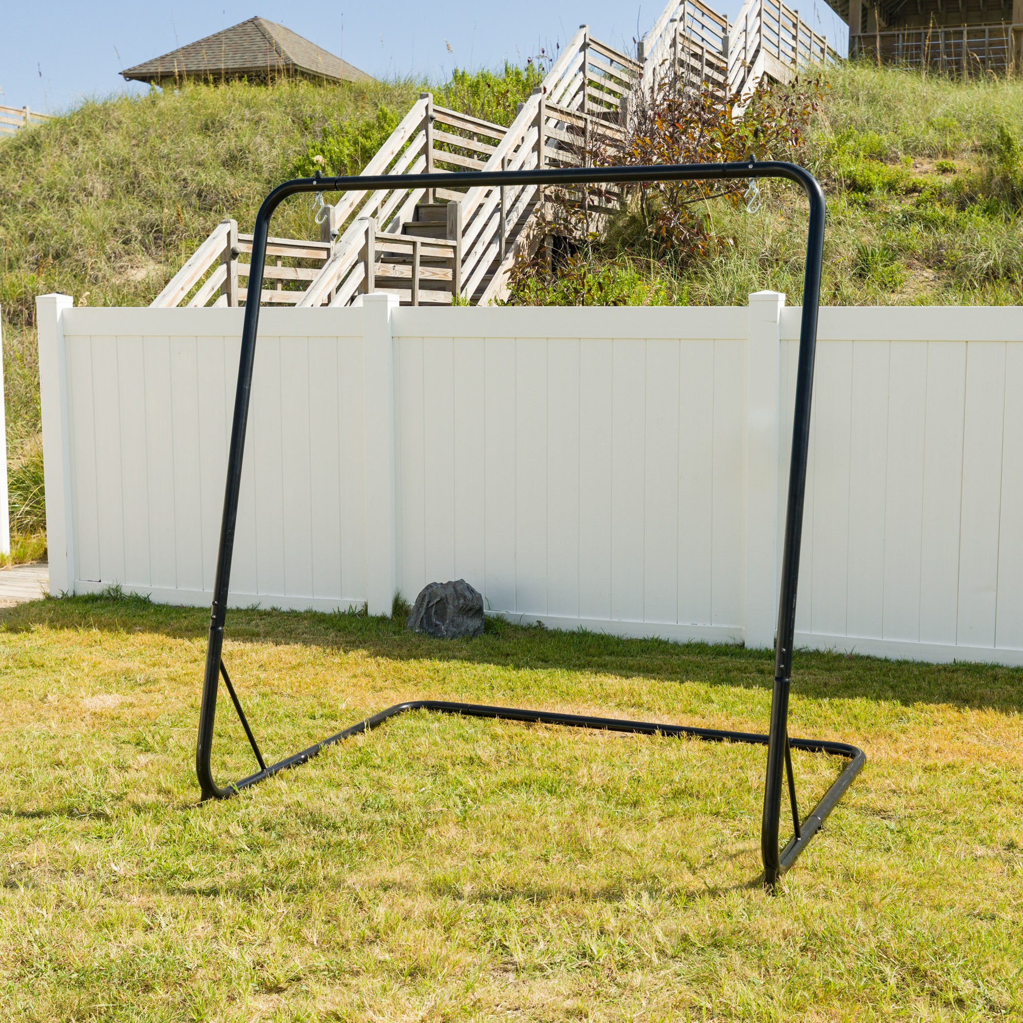 Designed with strength and style, the Compact Double Swing Stand offers a durable weather-resistant solution for your double swing. This freestanding swing stand is ideal for patios, porches, balconies, and smaller outdoor areas. Constructed from heavy-duty steel and finished with a rust-resistant powder coating, it will offer long lasting support. This stand is perfect for hanging a double swing without the need for trees or overhead beams, this stand combines stability, convenience, and low-maintenance performance.