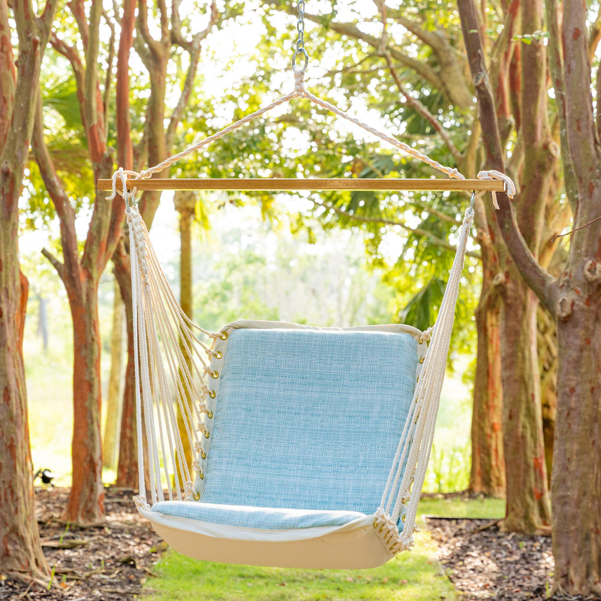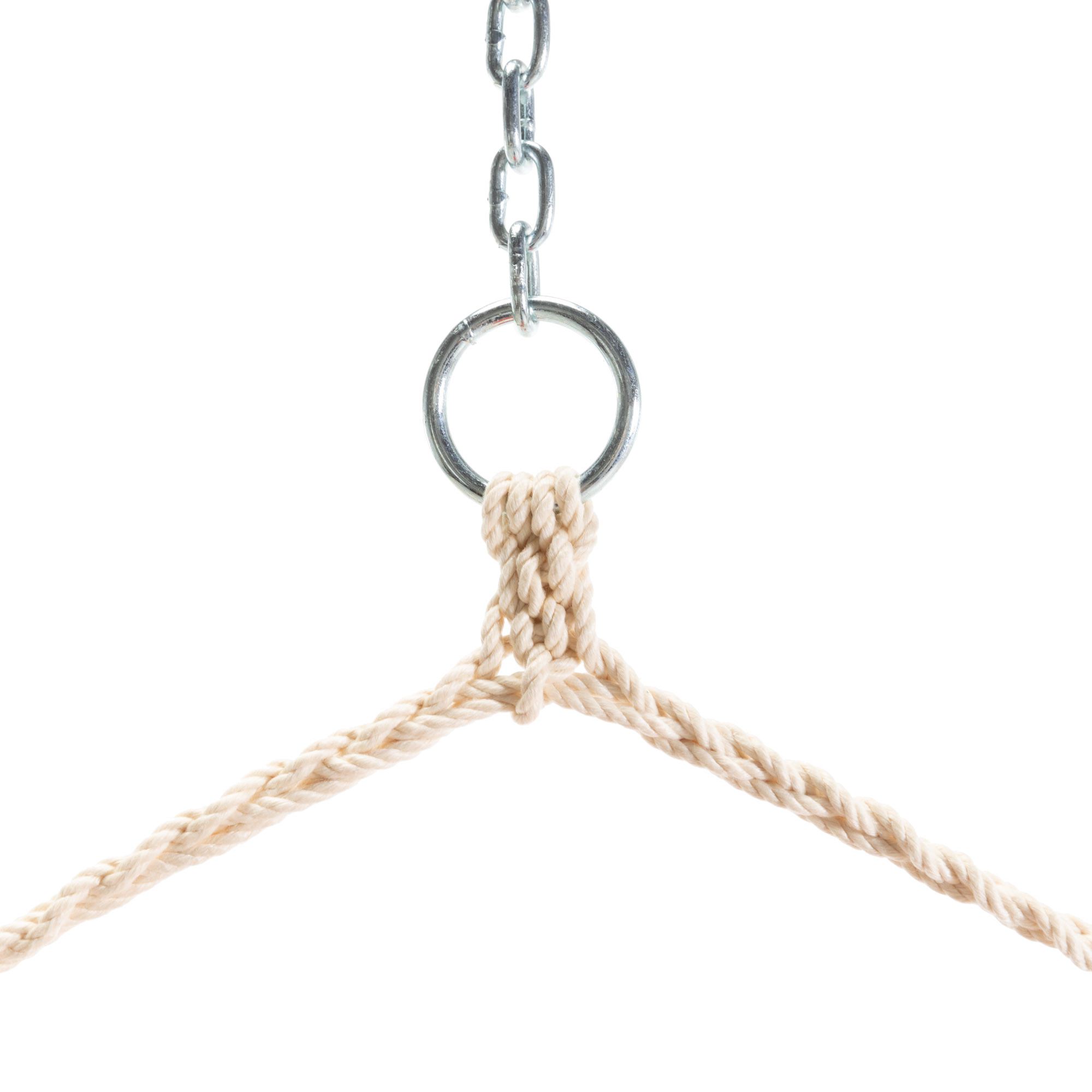 A wood that is naturally resistant to both rot and insect infestation, and has oils that repel water, Oak blends both exceptional strength and a handsome appearance. Our Oak spreader bars are repeatedly hand-dipped in honey-gold marine-grade varnish allowing a longer outdoor life and exceptional good looks. Our Oak spreader bars are a full 1 inch thick, compared to most other competitor’s spreader bars that measure at ⅞ inch. A thicker spreader bar allows for more stability, allowing the Swing Cushion to sit firmly between the Ring knots. Our spreader bars also feature countersink drilled holes. Countersink drilling is a technique that uses a trumpet drill bit that produces a hole with no hard angles, allowing the rope to pass through without any sharp edges to wear the rope.