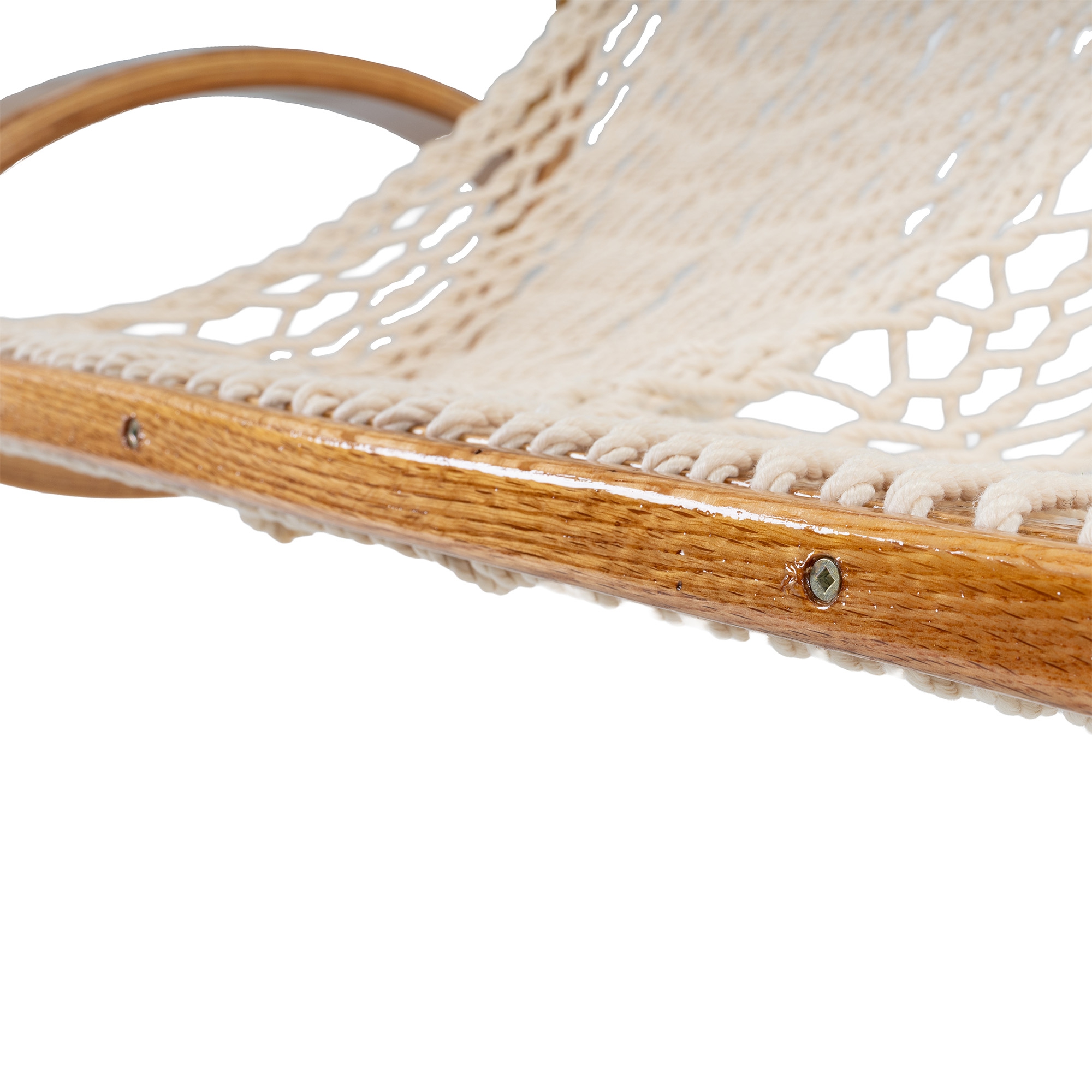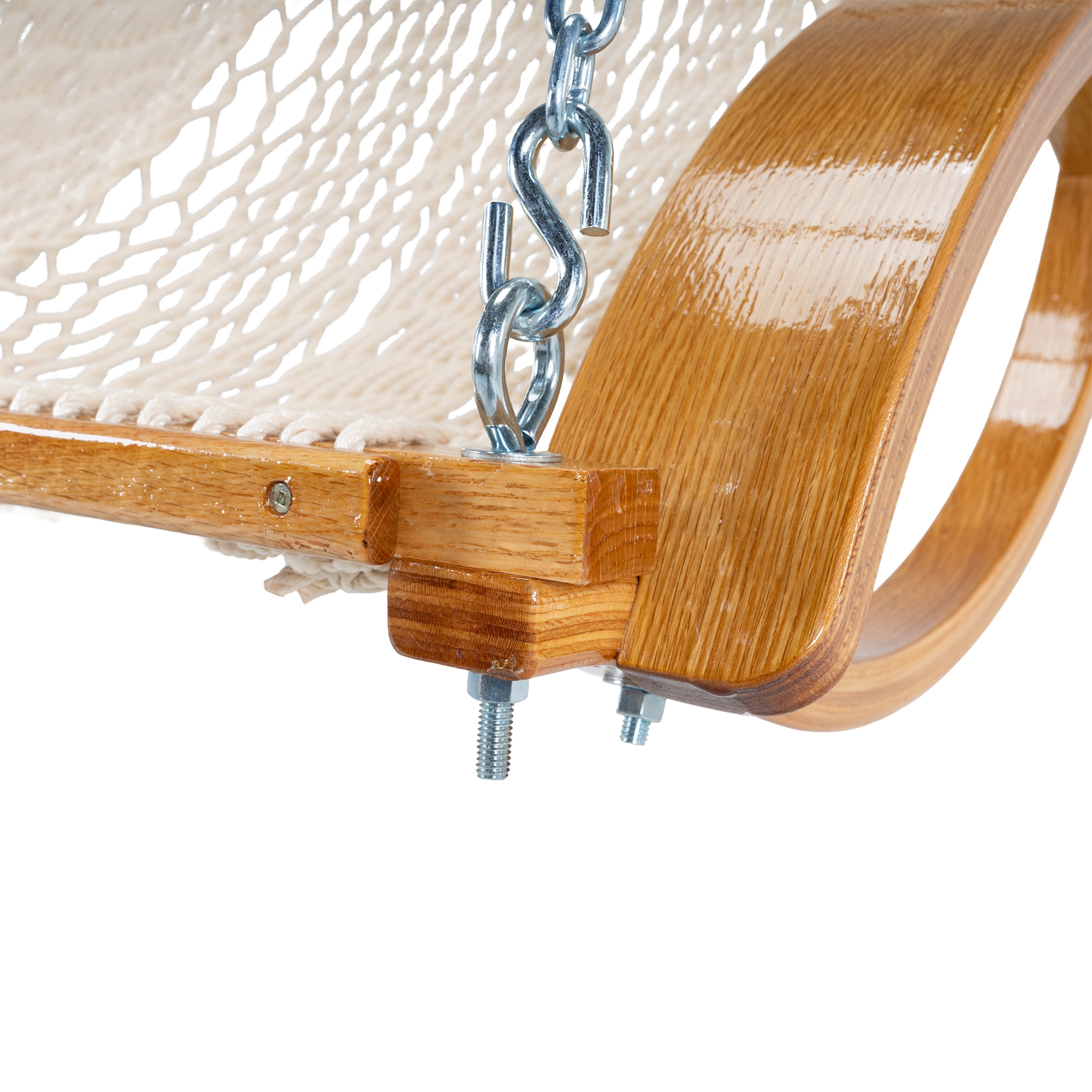 The Original Pawleys Island DURACORD® Double Rope Swing in Oatmeal provides comfort and style. The hand-woven DURACORD® sling seat complements the stylish "waterfall" design oak arms. Curved rocker arm design brings elegance and charm to outdoor setting.