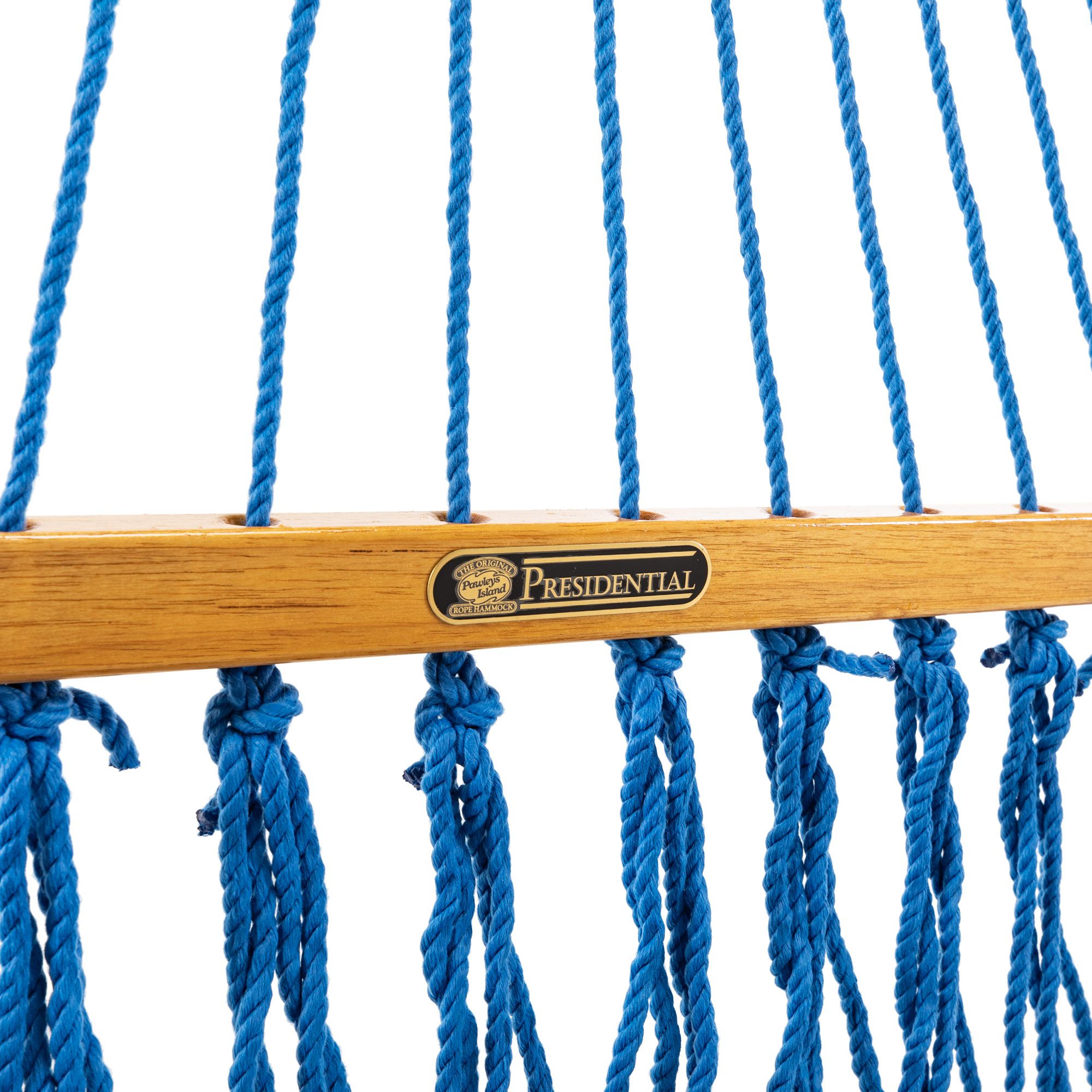 When folks talk about "floating in the big blue," they generally mean they're drifting lazily in the ocean — but we're now claiming that old expression for Our Coastal Blue-colored Presidential DURACORD® Rope Hammock! Settle into this bountiful hand-woven beauty, and you'll find yourself floating on air, in a sea of cottony-soft blue rope. And this way, with this kind of floating, you don't ever have to worry about getting salt water in your nose!