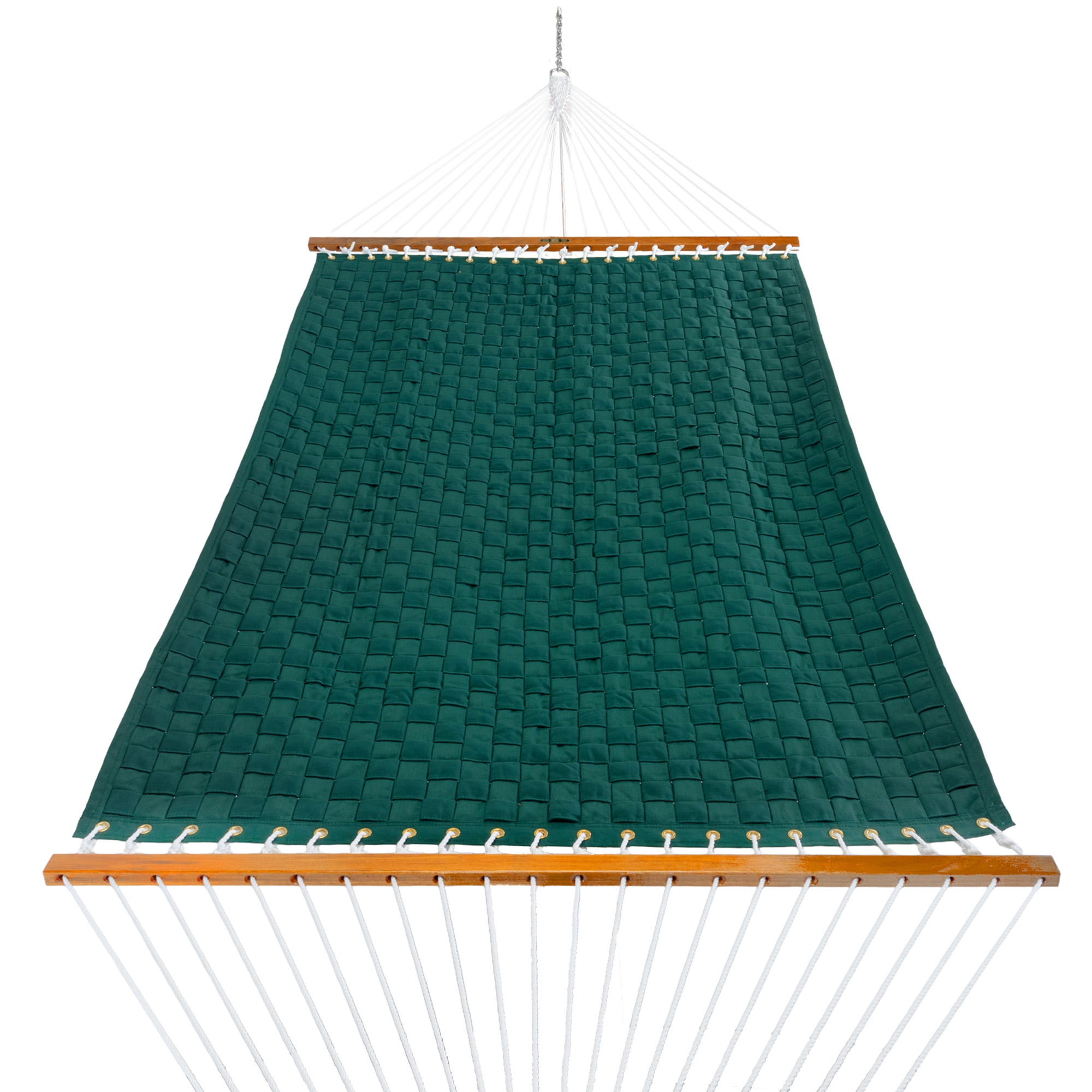 Whether you’re r napping or simply soaking in the beauty of the outdoors, the Green Large Soft Weave Hammock transforms your space into a haven of comfort and calmness. With its premium materials and nature-inspired design, this hammock is a must-have for anyone looking to combine luxury and practicality in their outdoor living area. Its woven construction provides superior support and relaxation, allowing you to sink into its plush embrace. While the soft padded fabric itself provides the sensation of a plush suspended bed, the individual overlapping thatch-woven fabric ribbons, pulling against each other much like ropes in a rope hammock, recreate that welcome sensation of being held aloft in a comfy net, which cradles the contours of your body even as you shift positions.