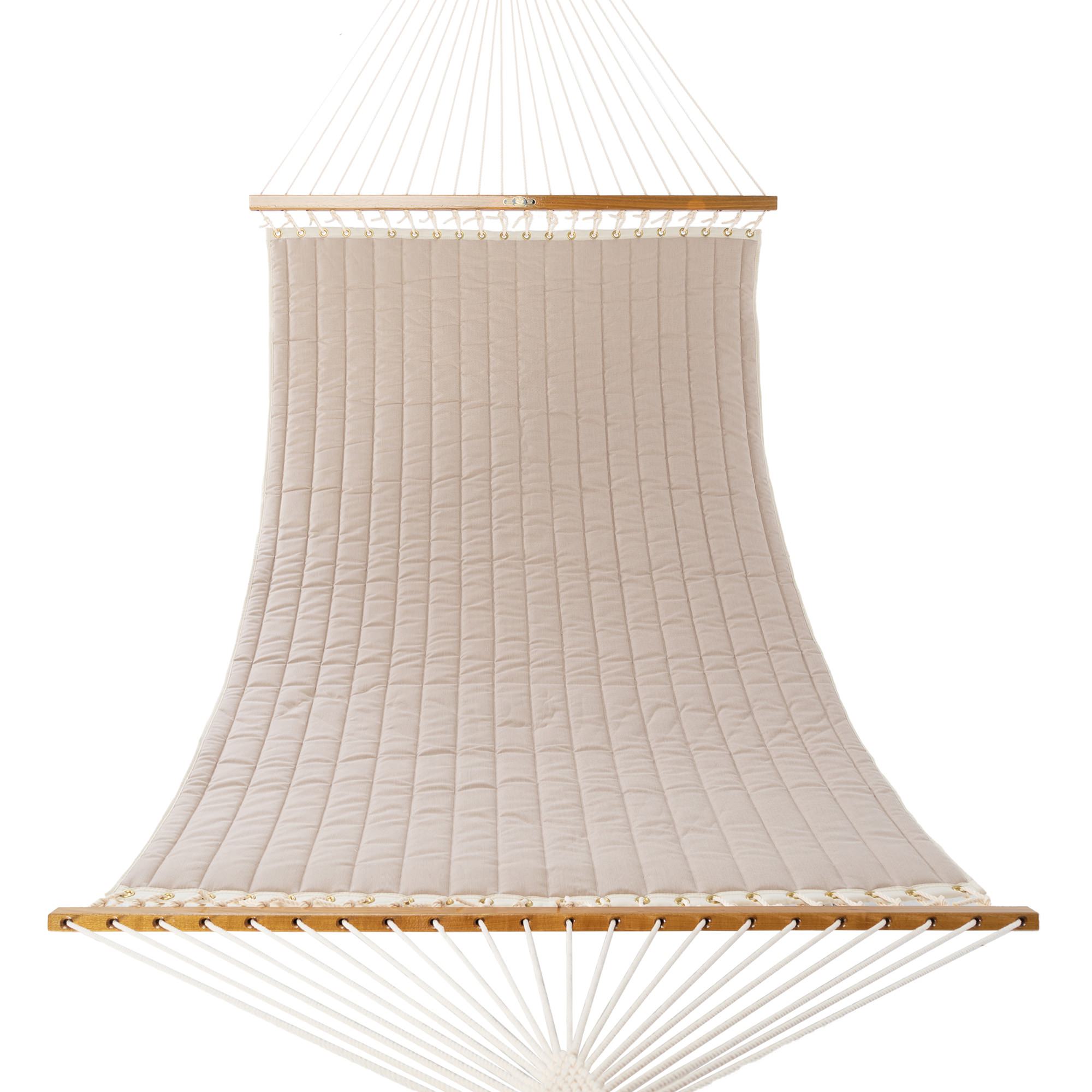 Relax and unwind with our Pawleys Spectrum Sand Quilted Hammock. Its understated elegance makes it an excellent foundation or accent for your décor, pairing effortlessly with complementing natural tones. Whether you're looking to create a tranquil outdoor retreat or elevate your living space with enduring sophistication, Spectrum Sand quilted hammock is a versatile and stylish solution. Its luxurious feel, combined with the high-quality Sunbrella fabric, ensures that it will remain a valued outdoor feature for years to come. Unwind and enjoy the soothing sway of this exquisite hammock, transforming your outdoor space into a true sanctuary.