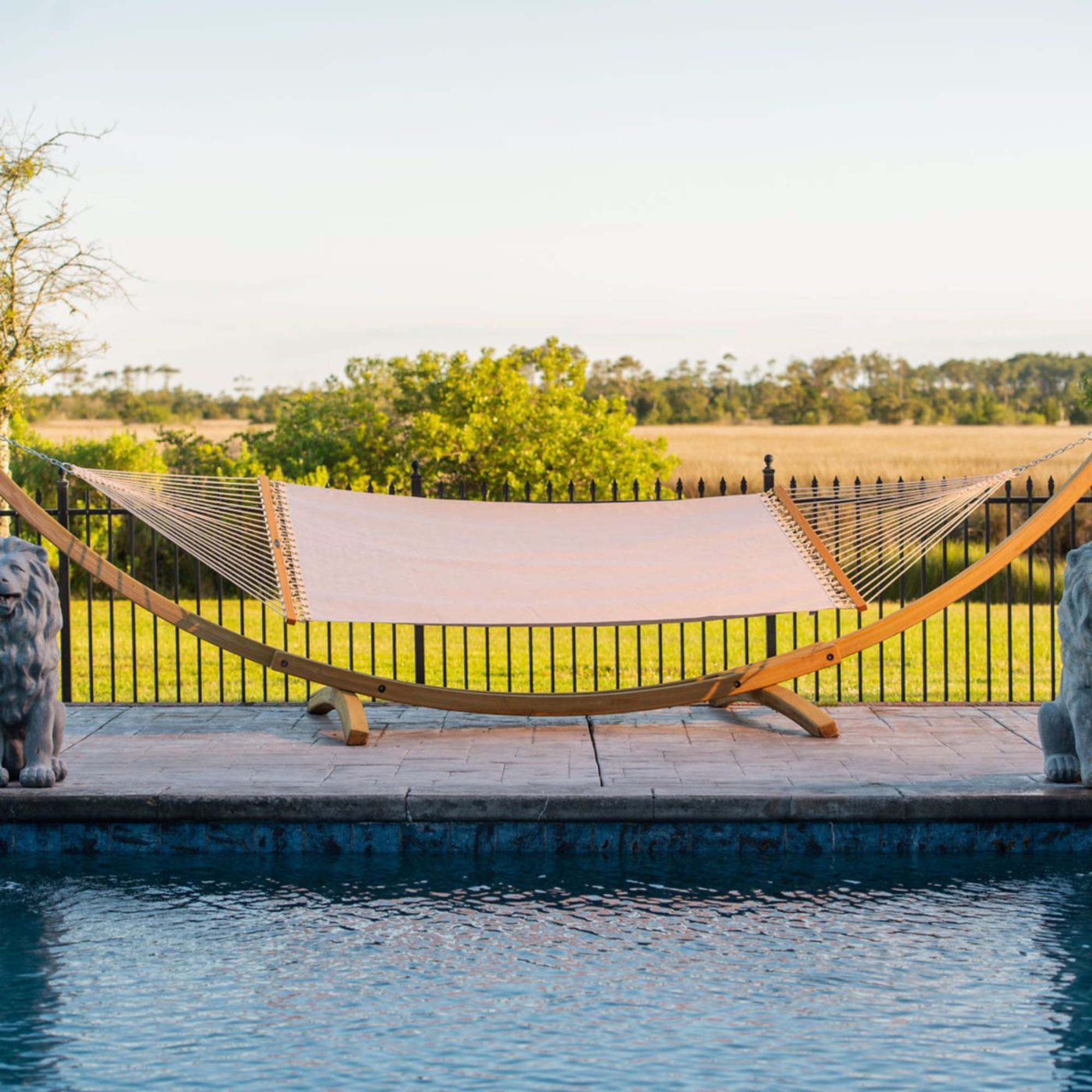 The Sunbrella Quick Dry Hammocks are designed to be the fastest drying hammocks on the market while still giving you the consistent comfort of a fabric hammock. So, when you want to dry off after getting out of the pool by soaking up some sun in your hammock, don’t worry about getting your hammock wet. The quick dry hammocks are recommended for any space, even poolside, shaded and high moisture areas. We use a high-performance Sunbrella Sling fabric that combines the exceptional strength of vinyl yarns with the softness of Sunbrella. This extremely durable outdoor fabric is fade and stain resistant and provides a sleek designer look and effortless maintenance.