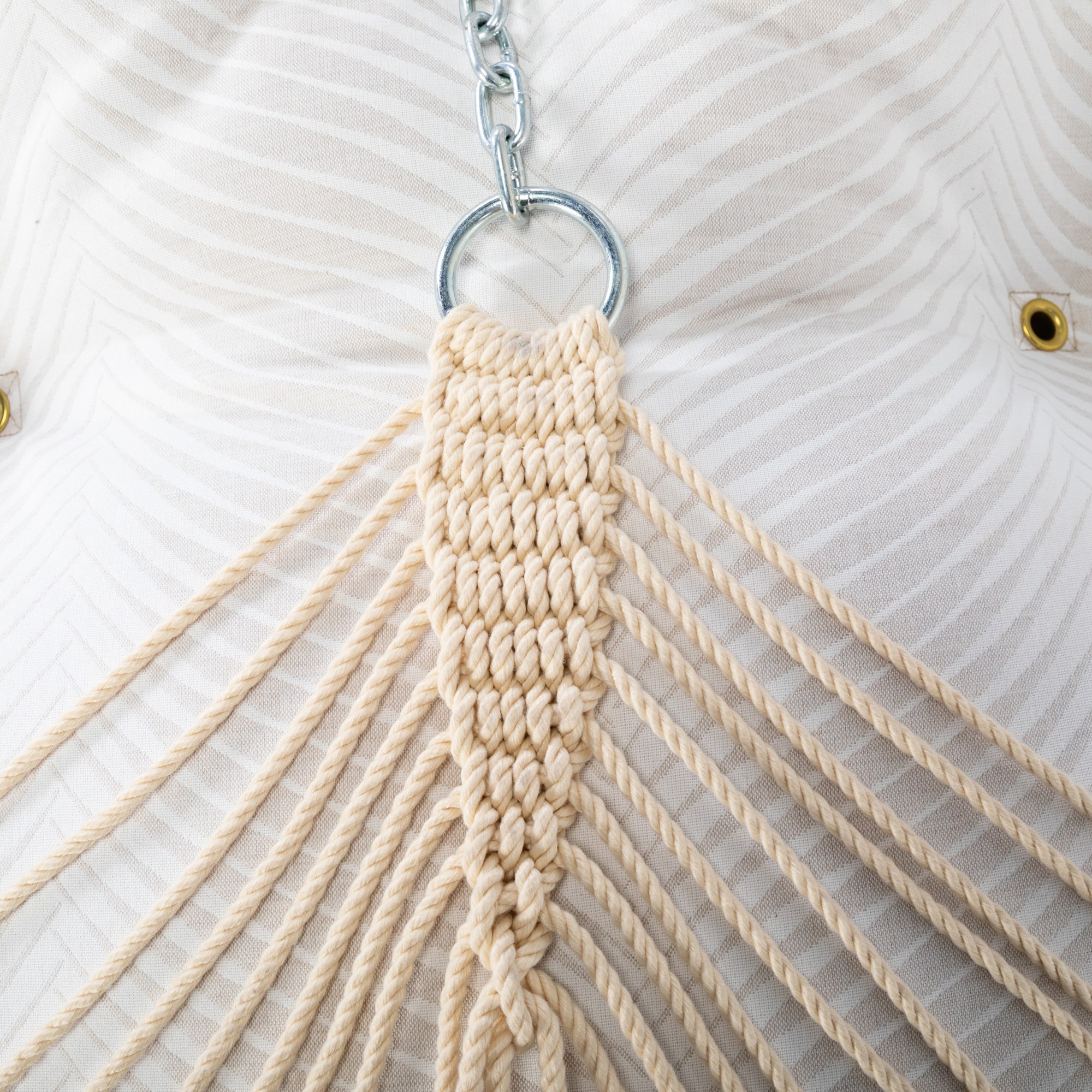 We plate all our hanging hardware with Zinc Plated Coating, including both tree hooks that come standard with our hammocks. The zinc plated coating prevents the accumulation of rust and ensures a longer outdoor life. Our very own One-piece ring-knot and chain, a product of years of development, permanently attaches the chain to the O-ring. This produces a hammock that is more durable and most importantly makes it impossible to lose the chain.
