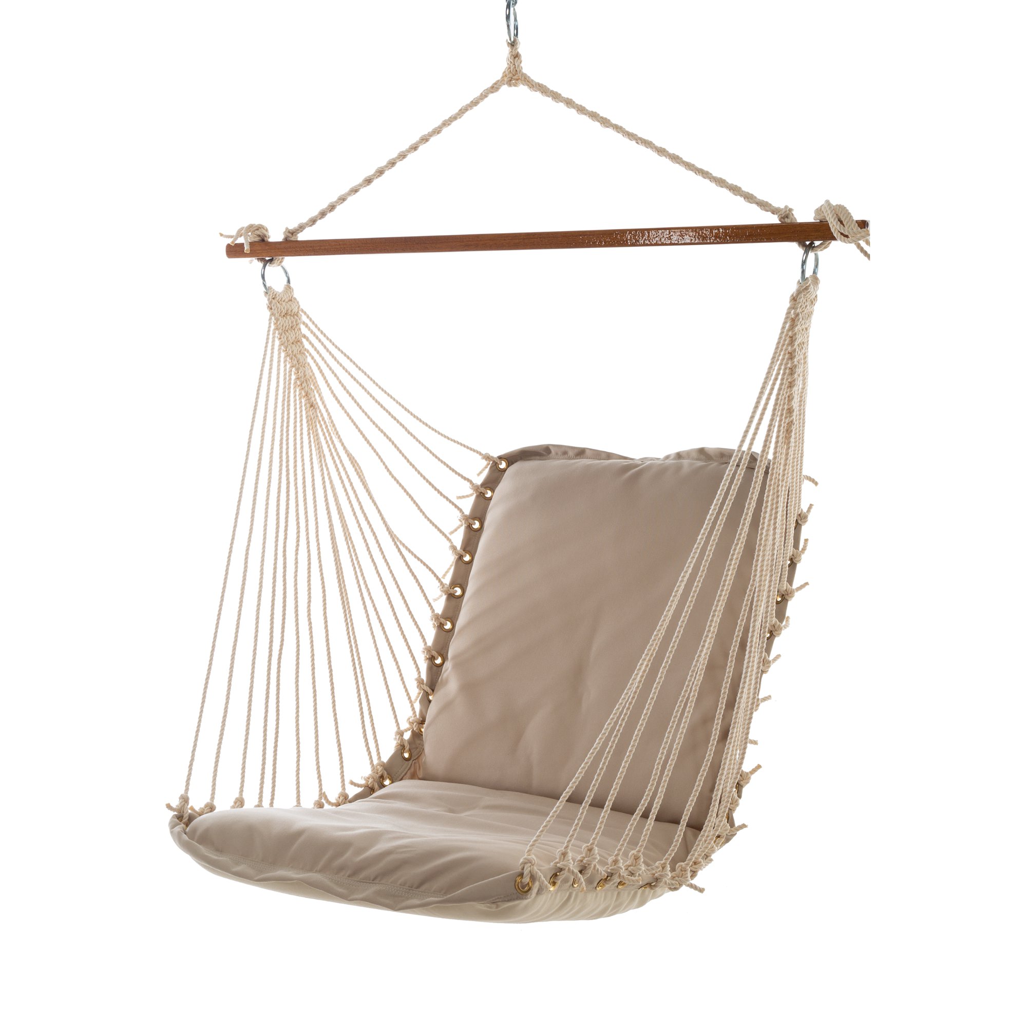 A wood that is naturally resistant to both rot and insect infestation, and has oils that repel water, Oak blends both exceptional strength and a handsome appearance. Our Oak spreader bars are repeatedly hand-dipped in honey-gold marine-grade varnish allowing a longer outdoor life and exceptional good looks. Our Oak spreader bars are a full 1 inch thick, compared to most other competitor’s spreader bars that measure at ⅞ inch. A thicker spreader bar allows for more stability, allowing the Swing Cushion to sit firmly between the Ring knots. Our spreader bars also feature countersink drilled holes. Countersink drilling is a technique that uses a trumpet drill bit that produces a hole with no hard angles, allowing the rope to pass through without any sharp edges to wear the rope.