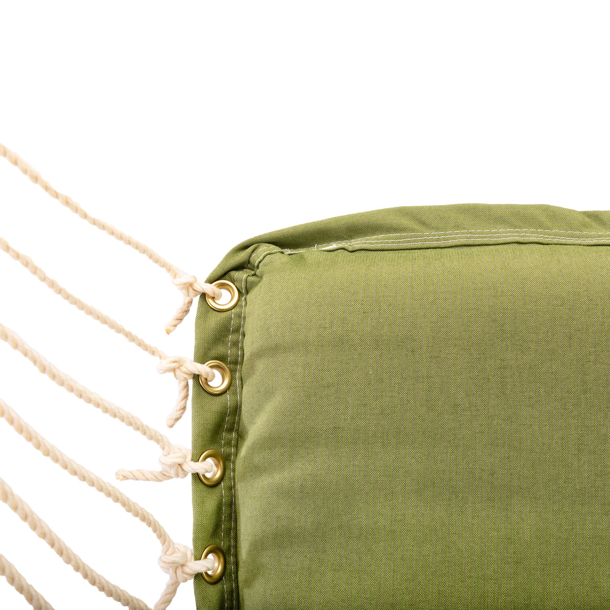 We are very particular with every aspect of our swings even down to the grommets on all our fabric swings. Every grommet we use has tiny spurs on the back of the connecting washer forcing part of the fabric into the lip of the grommet itself, creating a more secure bond. We have also experimented with making the fabric around the grommet stronger by sewing an “X” on the fabric before placing the grommet, by adding that extra stitching it gives those tiny spurs more fabric to grip onto. The industry standard, however, is the telescoping grommet, which our testing has shown rips lose from fabric before the rolled-rim grommet every time.
