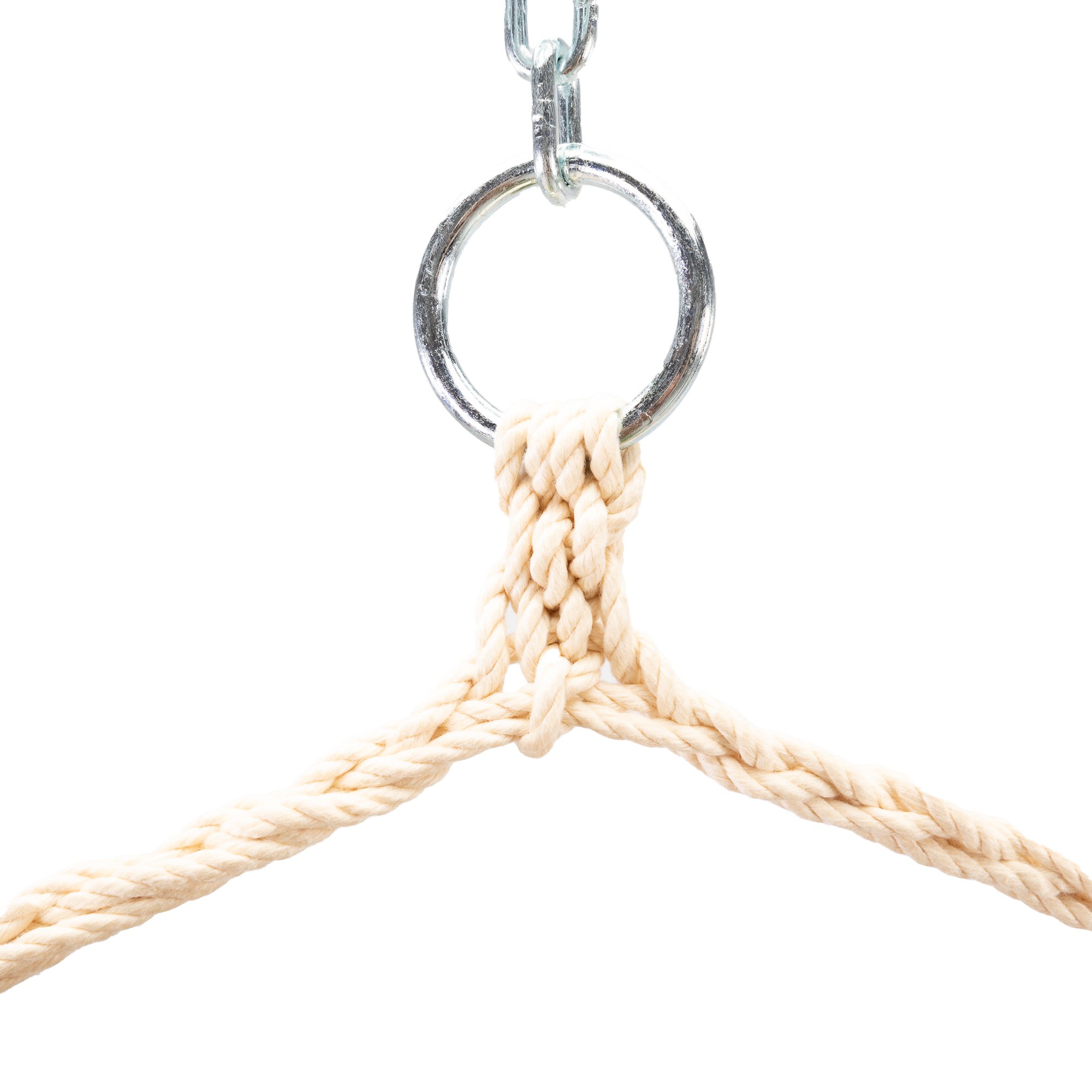 We plate all our hanging hardware with Zinc Plated Coating, including Hanging bracket that come standard with our single swings. The zinc plated coating prevents the accumulation of rust and ensures a longer outdoor life. Our very own One-piece ring-knot and chain, a product of years of development, permanently attaches the chain to the O-ring. This produces a swing that is more durable and most importantly makes it impossible to lose the chain.