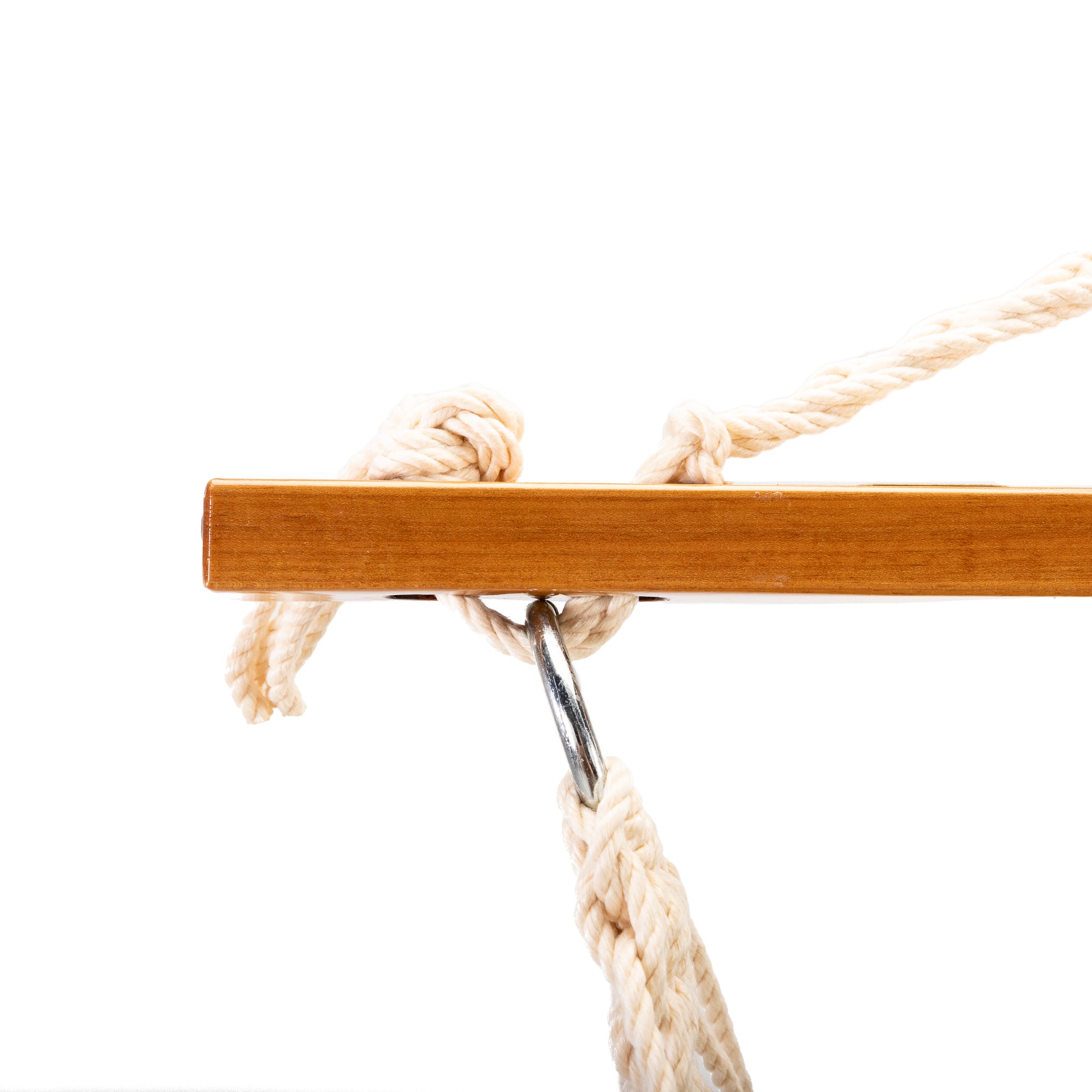 A wood that is naturally resistant to both rot and insect infestation, and has oils that repel water, Oak blends both exceptional strength and a handsome appearance. Our Oak spreader bars are repeatedly hand-dipped in honey-gold marine-grade varnish allowing a longer outdoor life and exceptional good looks. Our Oak spreader bars are a full 1 inch thick, compared to most other competitor’s spreader bars that measure at ⅞ inch. A thicker spreader bar allows for more stability, allowing the Swing Cushion to sit firmly between the Ring knots. Our spreader bars also feature countersink drilled holes. Countersink drilling is a technique that uses a trumpet drill bit that produces a hole with no hard angles, allowing the rope to pass through without any sharp edges to wear the rope.