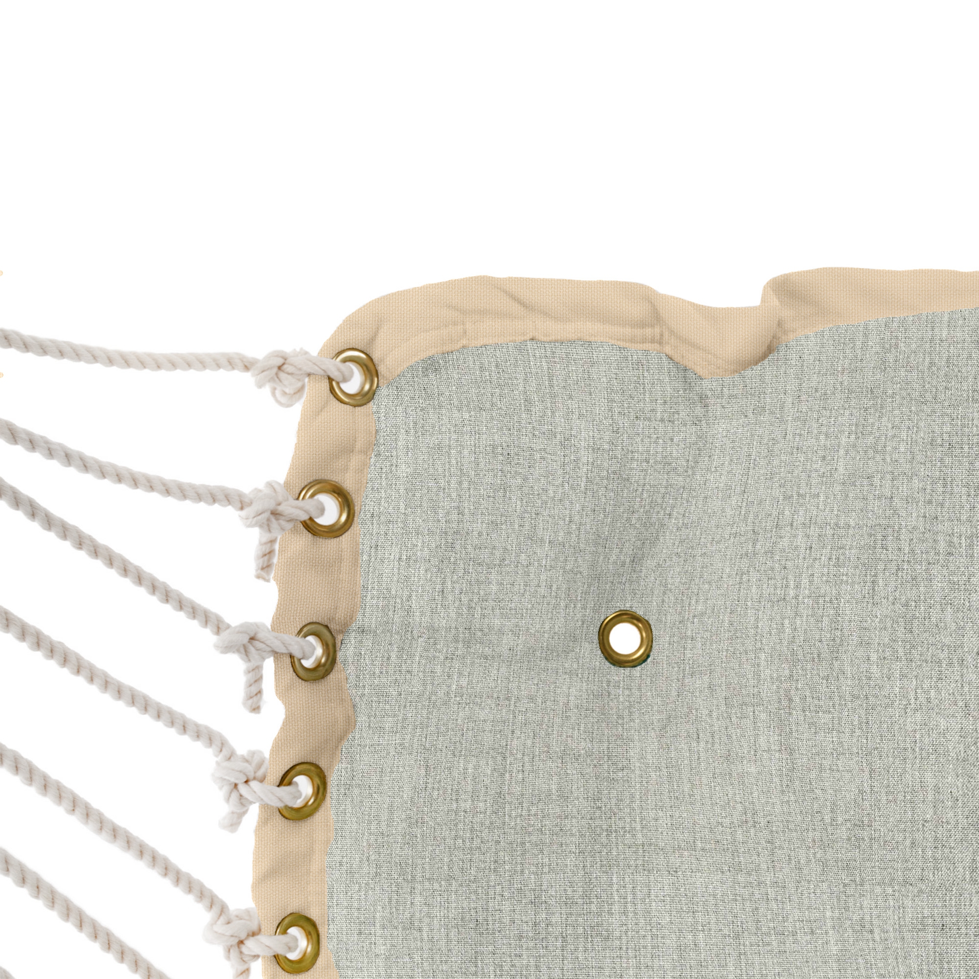 We are very particular with every aspect of our swings even down to the grommets on all our fabric swings. Every grommet we use has tiny spurs on the back of the connecting washer forcing part of the fabric into the lip of the grommet itself, creating a more secure bond. We have also experimented with making the fabric around the grommet stronger by sewing an “X” on the fabric before placing the grommet, by adding that extra stitching it gives those tiny spurs more fabric to grip onto. The industry standard, however, is the telescoping grommet, which our testing has shown rips lose from fabric before the rolled-rim grommet every time.